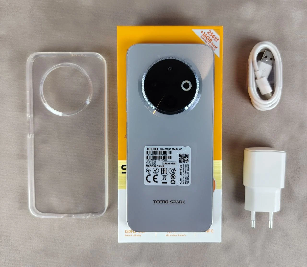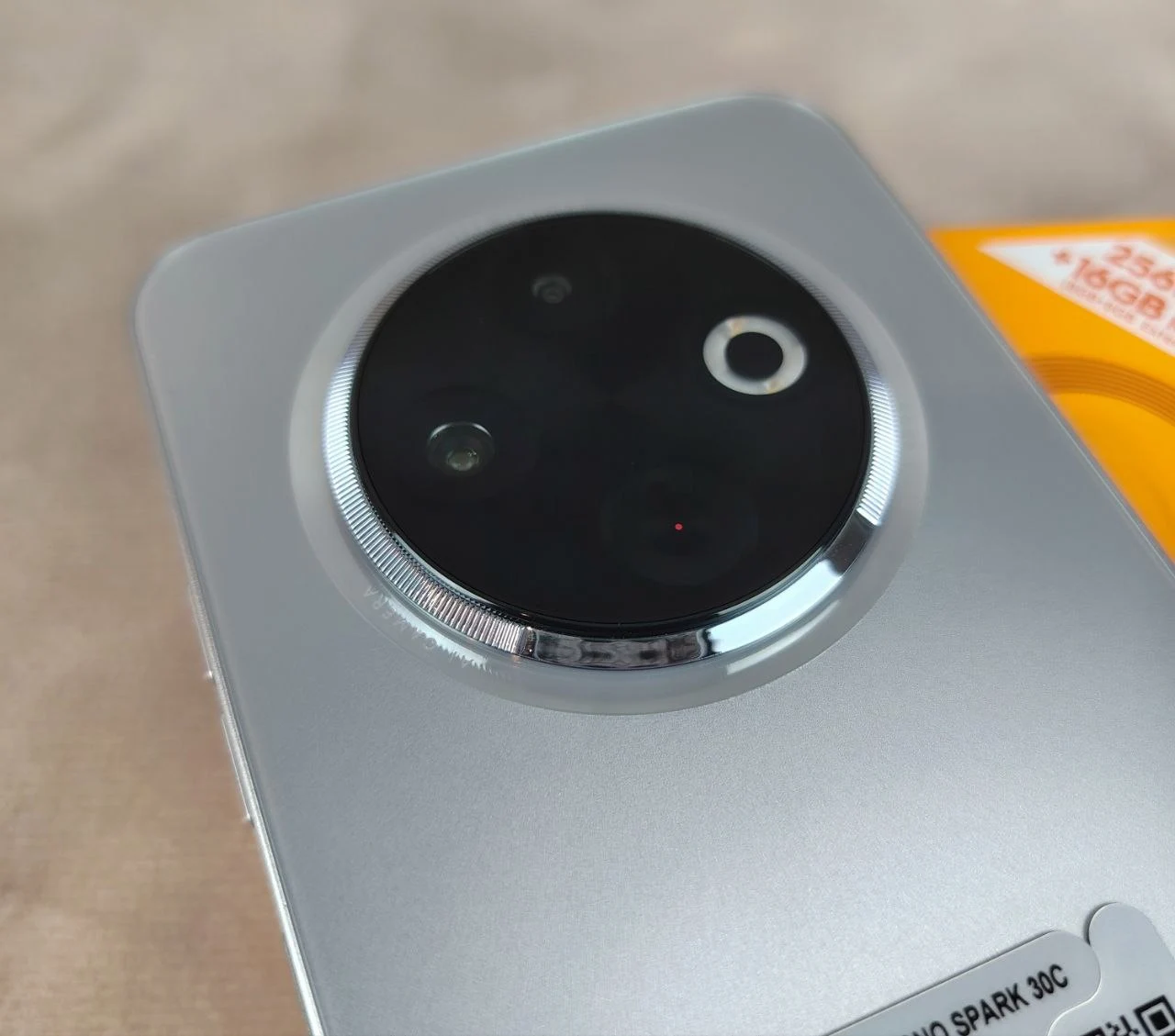 Корпус смартфона TECNO SPARK 30C обладает текстурированной задней панелью, что придает дизайну необычный акцент. Дискообразный модуль камер дополнен кольцом, напоминающим объектив фотоаппарата. Защита от пыли и брызг по стандарту IP54.